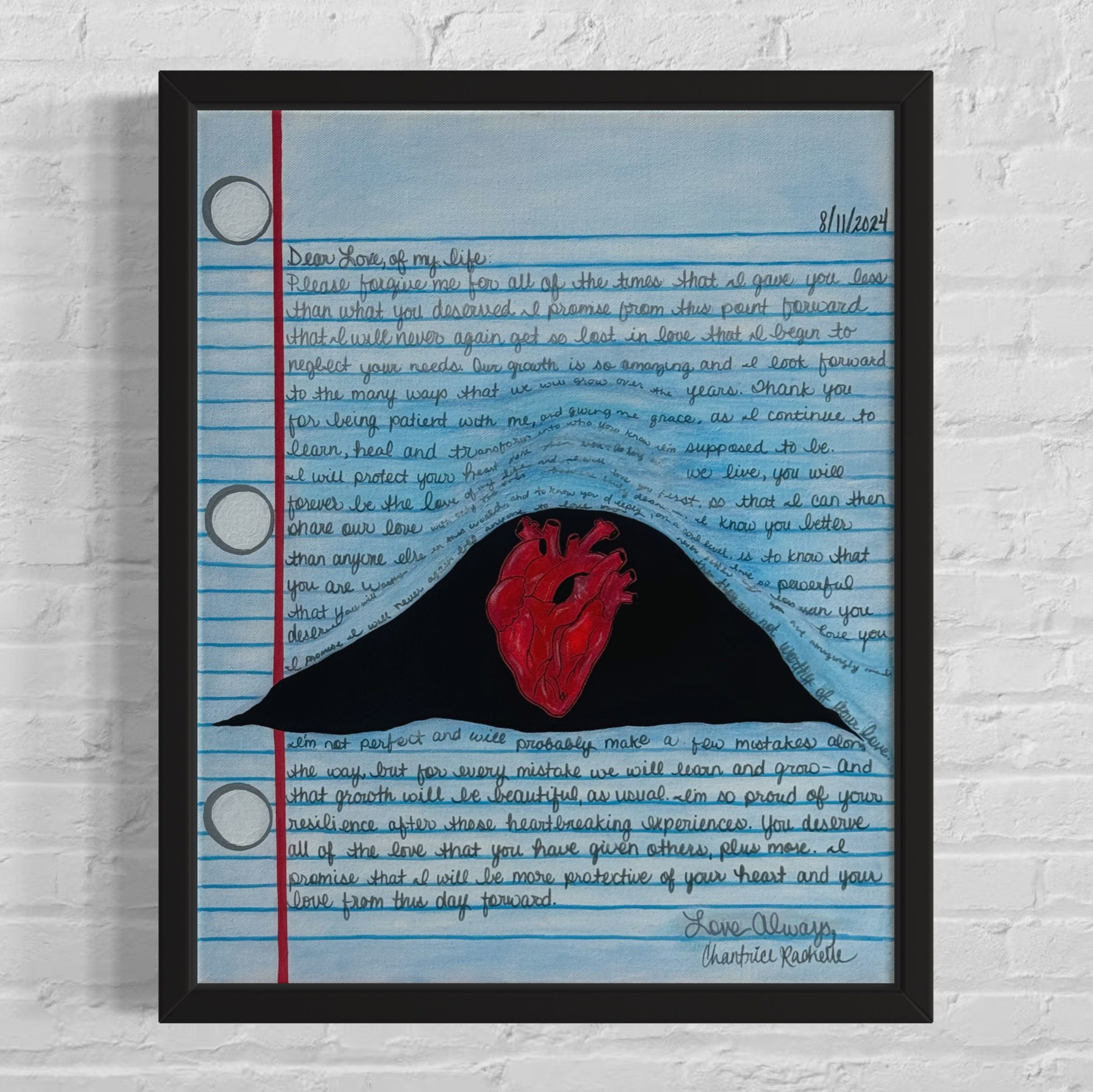 Of course, throughout the show, I was asked which piece was my personal favorite. That is always a hard question to answer because each piece holds a special place with me for various reasons. One piece may be a favorite simply because it looks good to me and I’m in awe of how it turned out. Another piece may have a deep story that forced me to face some experiences and even undergo a certain level of healing in the process of its creation. Then some pieces posed a difficulty in the process of the creation, but in the end, it was everything I wanted, and sometimes more. However, the more I pondered on this question after the show, if I had to pick one favorite it would be Letter To Myself because that is probably the most authentic and vulnerable piece of art I have created thus far. While going through a breakup (which occurred 4 months before the show) I had to do a lot of self-reflection. With all of the pain I had previously endured and the pain that I was currently enduring, I had to go deep within and figure out what I had been doing wrong with myself. When it was all said and done, I had to make a promise to myself, so I wrote a letter one day and decided I would put it on the blank letter that I’d painted on canvas nearly a year prior. Then, when it was finished, I had to decide if this would be a piece I’d share with the world. To be honest, I almost did not share it, but I knew that I had to, and with the feedback I received, I’m so glad I did.
