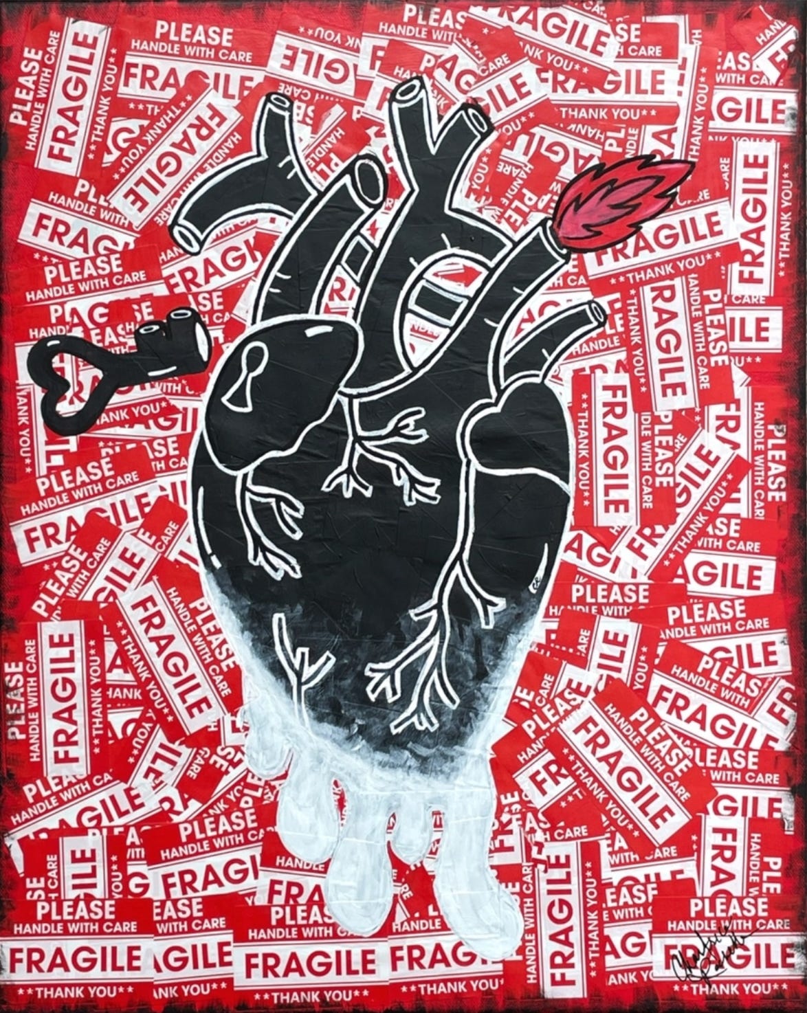Handle With Care, is a mixed media piece with fragile stickers as the background while a melting black and white heart is the focal point. There is also a key and a flame seen in this piece which tells that a key is unlocking the heart with a flame ignited that is melting away the icebox that was once there; however, the heart is still in a fragile state and must be handled with care. One viewer saw, through this piece, the heart as being one of our most precious and fragile organs, and because of our anatomical protections for the heart, it isn’t supposed to be damaged.
